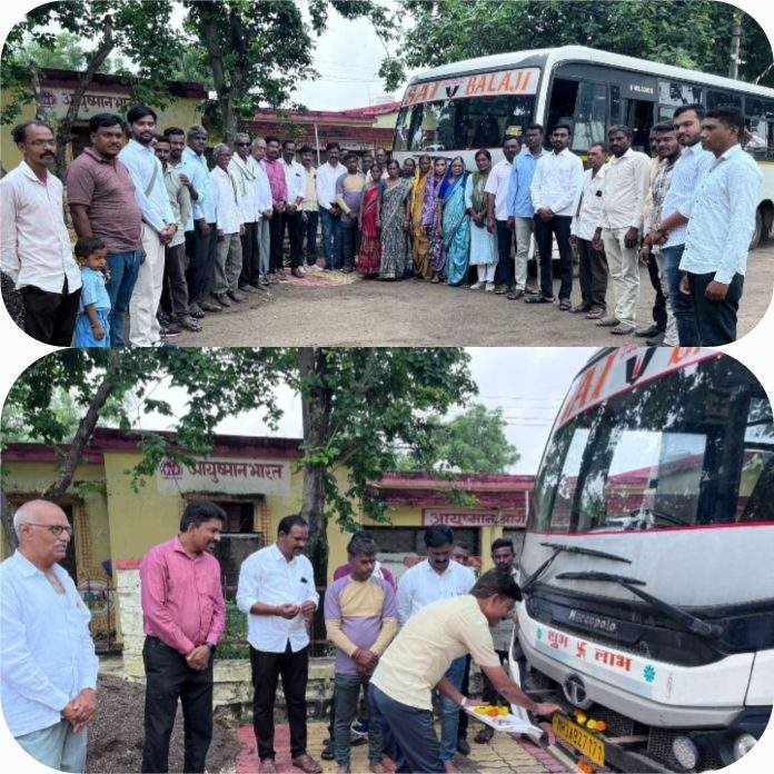 सेवाग्रामकडे रवाना होणाऱ्या रुग्णसेवा बसचे पूजन माजी उपसरपंच मोरेश्वर आस्वले यांच्या हस्ते करण्यात आले. यावेळी सरपंच अरुण रागीट, पोलिस पाटील संदीप तोडासे, तसेच ग्रामपंचायत सदस्य आणि गावातील मान्यवर उपस्थित होते.