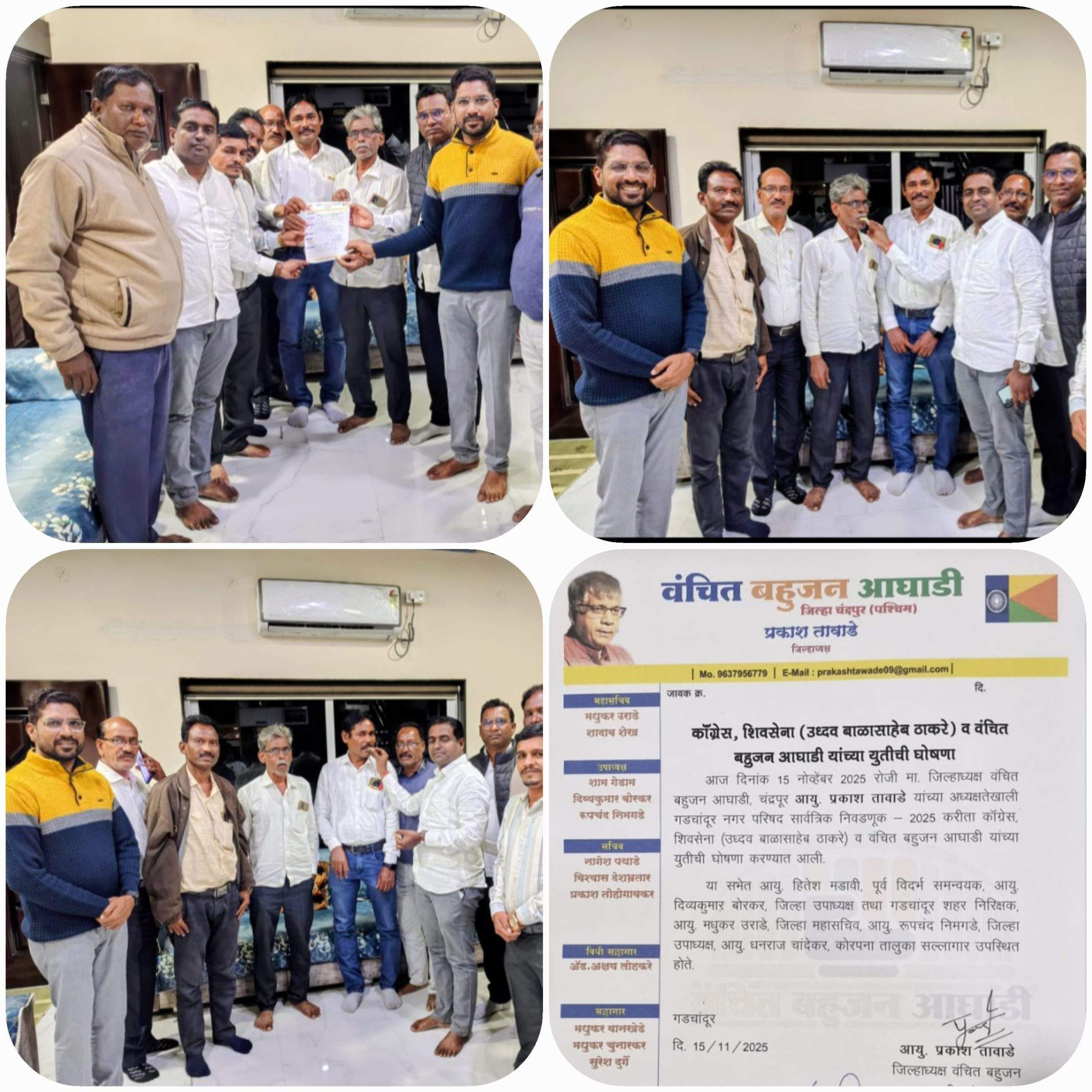 ही युती वंचित बहुजन आघाडीचे जिल्हाध्यक्ष आयु. प्रकाश तावडे यांच्या अध्यक्षतेखाली १५ नोव्हेंबर २०२५ रोजी जाहीर करण्यात आली. गडचांदूर नगरपरिषद सार्वत्रिक निवडणूक–२०२५ एकत्रितपणे लढविण्याचा निर्णय बैठकीत घेण्यात आला. युती जाहीरनाम्यावर काँग्रेस, शिवसेना (उद्धव ठाकरेंच्या गट) आणि वंचित बहुजन आघाडीच्या पदाधिकाऱ्यांची सह्या असून तीनही पक्षांच्या संयुक्त लढ्याची भूमिका स्पष्ट दिसून आली.