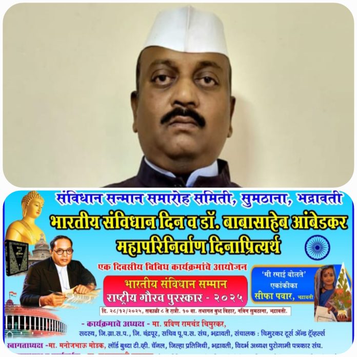 हा सन्मान सोहळा दि. 28 डिसेंबर 2025 रोजी सकाळी 11 वाजता, तथागत बुद्धविहार, नविन सुमठाना, भद्रावती (जि. चंद्रपूर) येथे संपन्न होणार आहे. यावेळी सन्मानपत्र, मोमेंटो, शाल व श्रीफळ देऊन त्यांचा गौरव करण्यात येणार आहे. या पुरस्काराचे आयोजन संविधान सन्मान समारंभ समिती, सुमठाना – भद्रावती यांच्या वतीने करण्यात आले आहे.