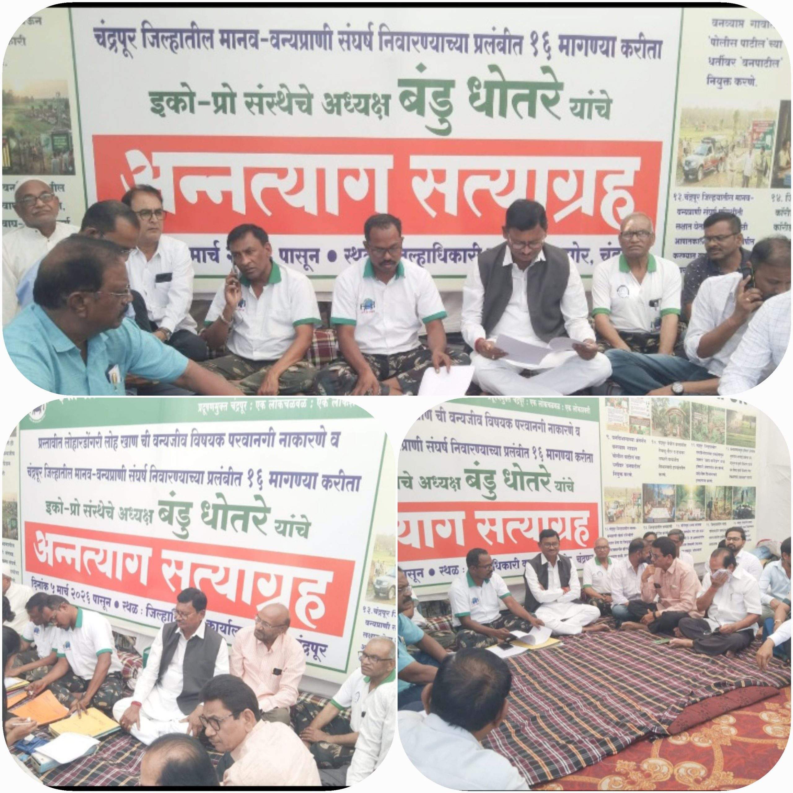 पर्यावरणवादी कार्यकर्ते बंडू धोतरे यांनी दि. ५ मार्च २०२६ पासून जिल्हाधिकारी कार्यालय, चंद्रपूर समोर अन्नत्याग सत्याग्रह सुरू केला आहे. या आंदोलनातून मानव–वन्यप्राणी संघर्षावर ठोस उपाययोजना करणे, ताडोबा परिसरातील महत्त्वाच्या कॉरिडोरमध्ये प्रस्तावित लोहारडोंगरी लोह खाण प्रकल्पास वन्यजीव विषयक परवानगी नाकारावी, व्याघ्र जिल्हा संकल्पना प्रभावी करणे, चंद्रपूर–मुल मार्गाची सुधारणा, वनरक्षकांना मदतनीस उपलब्ध करून देणे, पीआरटी (प्रॉब्लेम रिस्पॉन्स टीम) ला मानधन देणे तसेच बिबट समस्यामुक्त ग्राम योजना प्रभावीपणे राबविणे यांसह एकूण १६ मागण्या करण्यात आल्या आहेत.
