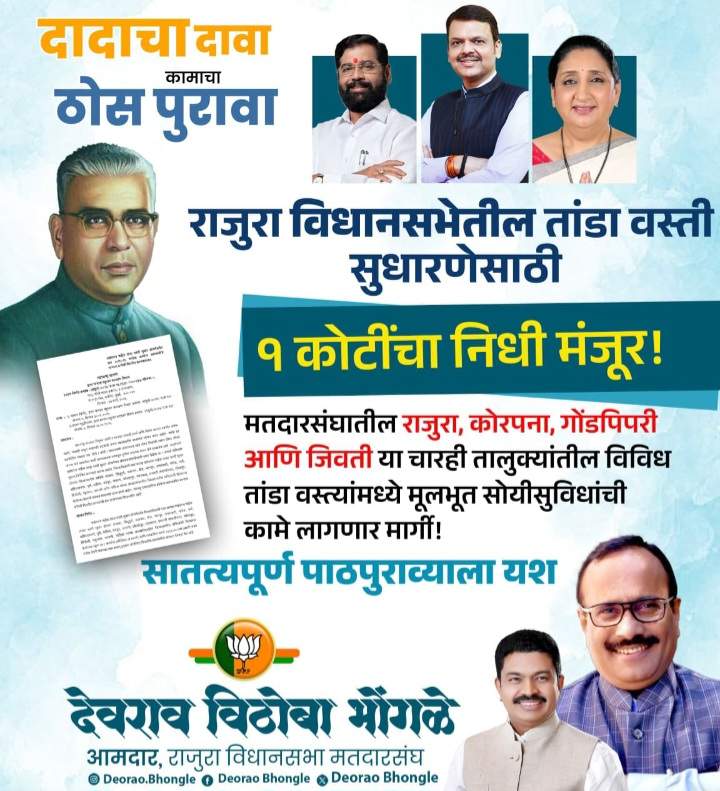 या निधीच्या मंजुरीसाठी आमदार देवराव भोंगळे यांनी शासनस्तरावर सातत्याने पाठपुरावा केला होता. मतदारसंघातील प्रत्येक तांडा वस्तीपर्यंत विकास पोहोचवण्याच्या उद्देशाने त्यांनी इतर मागास व बहुजन कल्याण मंत्री ना. अतुल सावे यांच्याकडे वारंवार पाठपुरावा करून हा निधी मिळवण्यात यश मिळवले.