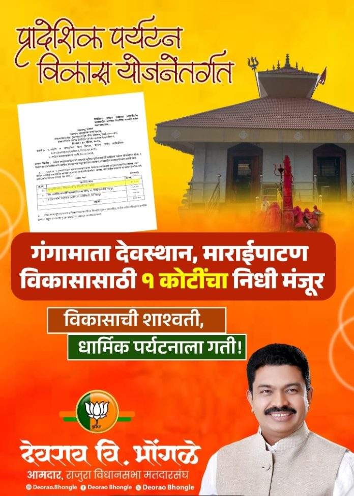 рджреБрд░реНрдЧрдо рдЬрд┐рд╡рддреА рддрд╛рд▓реБрдХреНрдпрд╛рддреАрд▓ рднрд╛рд╡рд┐рдХрд╛рдВрдЪреЗ рд╢реНрд░рджреНрдзрд╛рд╕реНрдерд╛рди рдЕрд╕рд▓реЗрд▓реНрдпрд╛ рдорд╛рд░рд╛рдИрдкрд╛рдЯрдг рдпреЗрдереАрд▓ рдЧрдВрдЧрд╛рдорд╛рддрд╛ рдордВрджрд┐рд░рд╛рдЪреНрдпрд╛ рд╡рд┐рдХрд╛рд╕рд╛рд╕рд╛рдареА рд░рд╛рдЬреНрдп рд╢рд╛рд╕рдирд╛рдиреЗ рез рдХреЛрдЯреА рд░реБрдкрдпрд╛рдВрдЪреНрдпрд╛ рдирд┐рдзреАрд▓рд╛ рдкреНрд░рд╢рд╛рд╕рдХреАрдп рдорд╛рдиреНрдпрддрд╛ рджрд┐рд▓реА рдЖрд╣реЗ. рдкреНрд░рд╛рджреЗрд╢рд┐рдХ рдкрд░реНрдпрдЯрди рд╡рд┐рдХрд╛рд╕ рдпреЛрдЬрдиреЗрдЕрдВрддрд░реНрдЧрдд рдордВрдЬреВрд░ рдЭрд╛рд▓реЗрд▓рд╛ рд╣рд╛ рдирд┐рдзреА рдордВрджрд┐рд░ рдкрд░рд┐рд╕рд░рд╛рдЪреНрдпрд╛ рд╕рд░реНрд╡рд╛рдВрдЧреАрдг рд╡рд┐рдХрд╛рд╕рд╛рд╕рд╛рдареА рдорд╣рддреНрддреНрд╡рдкреВрд░реНрдг рдард░рдгрд╛рд░ рдЖрд╣реЗ. рдпрд╛ рдХрд╛рдорд╛рд╕рд╛рдареА рджреЗрд╡рд░рд╛рд╡ рднреЛрдВрдЧрд│реЗ рдпрд╛рдВрдЪреНрдпрд╛ рд╕рд╛рддрддреНрдпрдкреВрд░реНрдг рдкрд╛рдардкреБрд░рд╛рд╡реНрдпрд╛рдЪреЗ рд╣реЗ рдлрд▓рд┐рдд рдорд╛рдирд▓реЗ рдЬрд╛рдд рдЖрд╣реЗ.